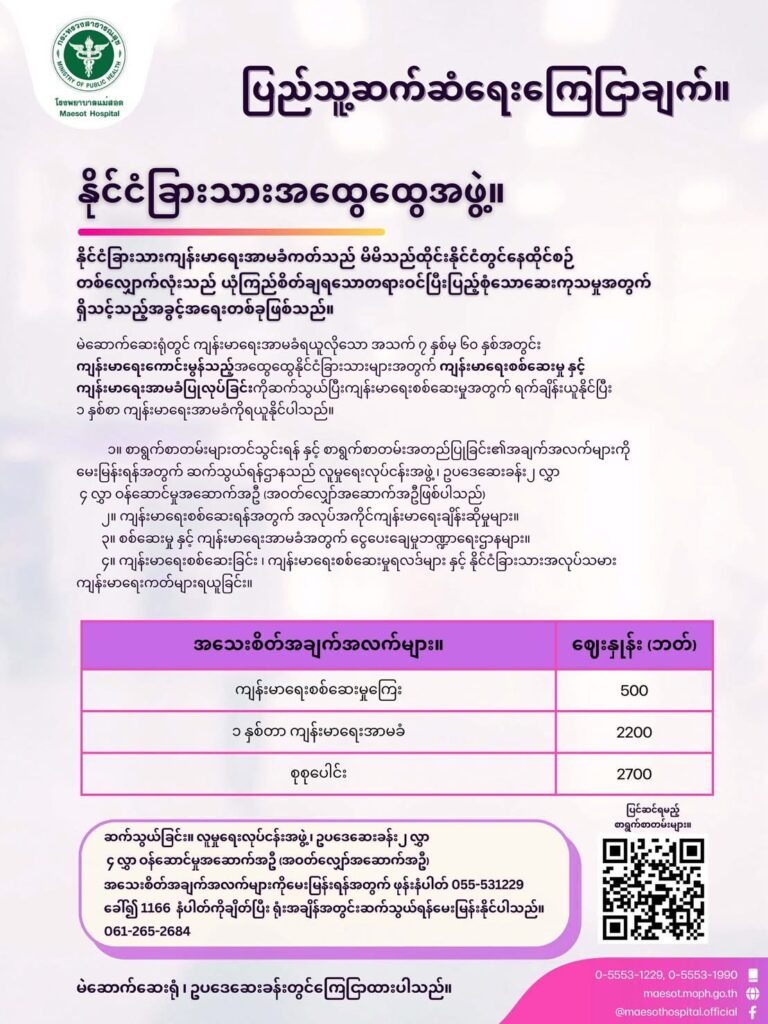Foreigners’ General Information The Foreign Health Insurance Card is an essential right for foreigners residing in Thailand, ensuring access to reliable, legal, and comprehensive medical services throughout their stay in the country. At Mae Sot Hospital, general foreigners aged 7 to 60 years who are in good health and wish to obtain health insurance may contact the hospital […]